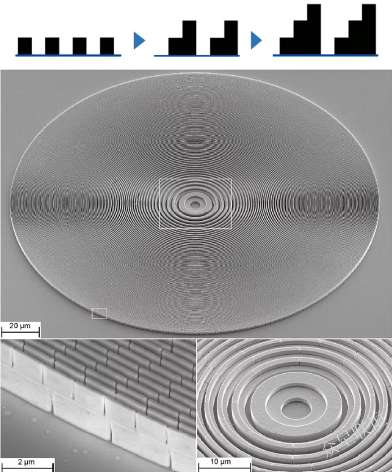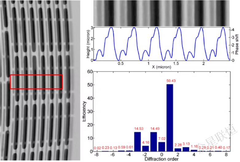 The higher the photon efficiency of an optic, the more photons pass through it, which means that more efficient optics save time and energy for the same result. Compared to traditional optics with binary gratings that have a theoretical photon efficiency limit at 40.5%, blazed gratings with only one additional step already increase the limit to 68.4%, and for another added step, it's 81.1%. As we use a process based on electron beam lithography to manufacture our optics, as opposed to mechanical ruling, we can easily implement designs with multi-step blazed gratings. In real world conditions, we have achieved a photon efficiency of more than 50% for diffractive zone plates, whereas the industry standard is 5-10%, or up to 25% for the most advanced applications. This way, not only experimenting time can be cut in half, pushing the progress of science, but also can the immense costs of running experiments at the worlds largest X-ray sources be cut in half. | |
