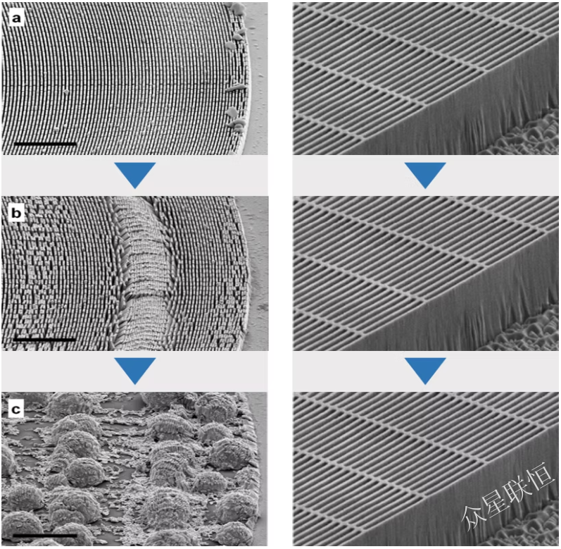 With our unique line-doubling technique, we can achieve an X-ray beam focus as precise as 5nm, which makes us the world record holder. With such a precise focus, X-ray imaging resolution reaches an unprecedented level, making visible what was once invisible and enabling completely new applications. The process comprises coating a sparse template with an atomic layer of Iridium before stripping the base structure off through reactive ion etching. | |