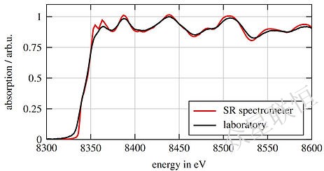 X-ray absorption spectrum of a 6um-thick Ni foil. Comparison to the spectrum obtained at a synchrotron (NSLS, resolving power E/ΔE = 5000) shows the high quality results of the table-top instrument. All relevant spectral features are present, allowing for the determination of chemical compounds. |