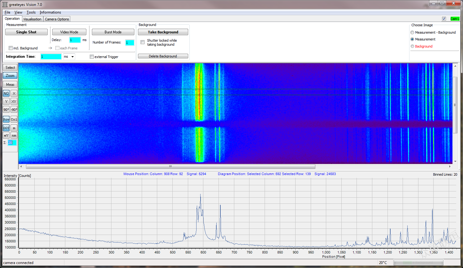The greateyes Vision software suite provides access to all camera functionalities. It includes comprehensive visualization, analysis and storage options and supports important features such as wavelength and geometric calibration, crop and burst modes and various file formats. The software runs on 32/64-bit Windows systems. For integration into other systems, a software development kit and drivers are available.