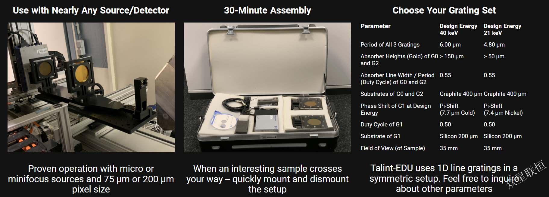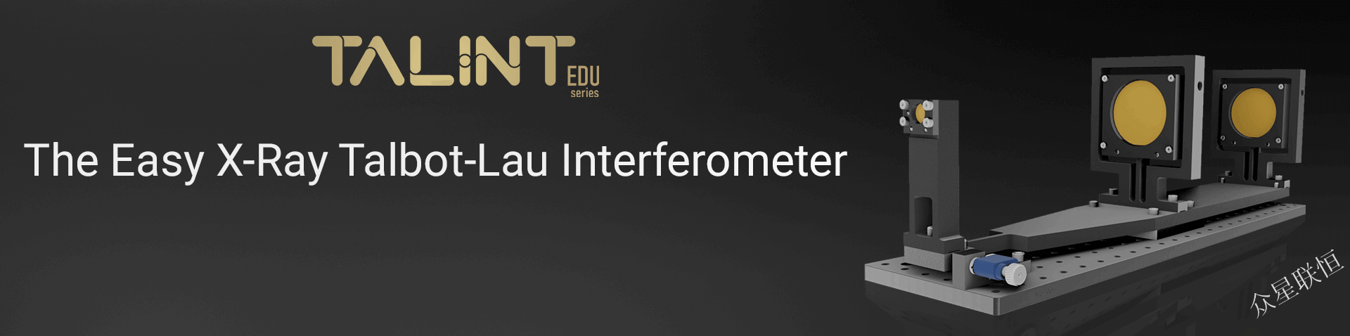 Talint-EDU is an X-ray interferometer to be added to your existing X-ray tube and detector. It consists of all the necessary hardware components to obtain the three imaging modes: absorption, phase-contrast and dark-field contrast.
