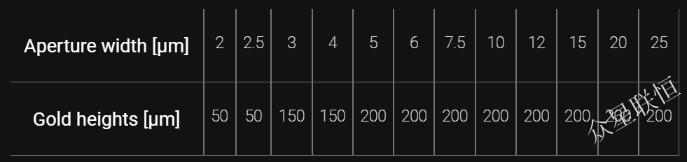 Gold thickness per aperture size according to the table below. Parts come mounted to a holder. Slits are 10 mm long in 50 μm sections separated by 2 μm gaps. Slit arrays and crosses are available upon request.
