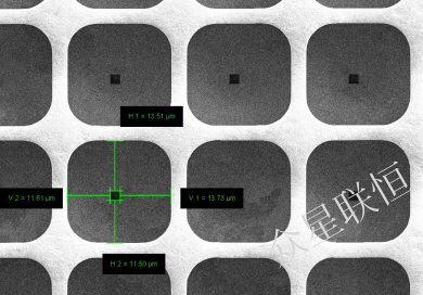 Gold thickness per aperture size according to the table below. Parts come mounted to a holder. Slits are 10 mm long in 50 μm sections separated by 2 μm gaps. Slit arrays and crosses are available upo
